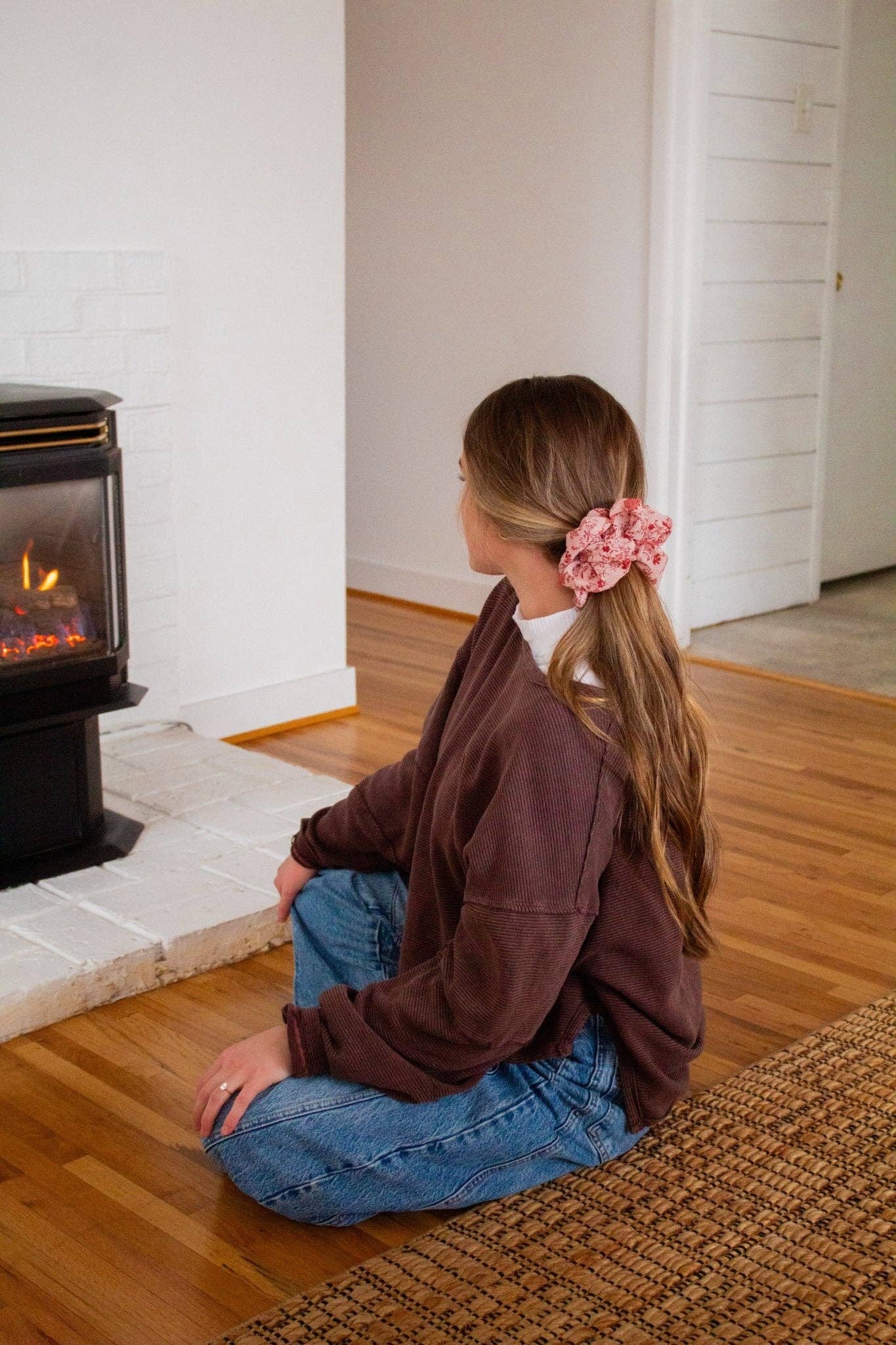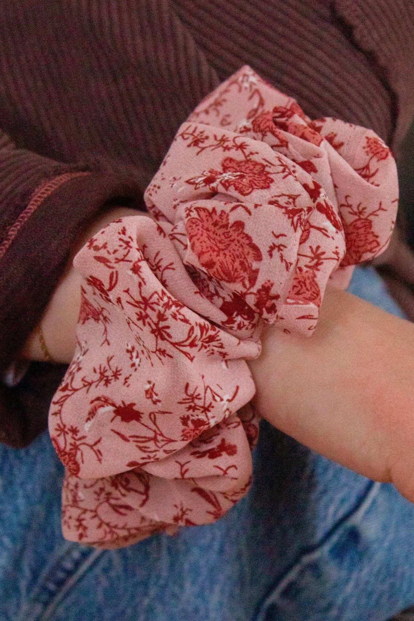 The Elsa Scrunchie is the perfect accessory to brighten up your hair routine this season. Made from a dark pink, silky chiffon fabric, this jumbo scrunchie features an adorable maroon floral pattern, adding a festive, cutesy touch to any look. The soft fabric is gentle on your hair, providing a comfortable, secure hold for any hairstyle your heart desires. Whether you're styling a ponytail, bun, or anything in between, the Elsa Scrunchie will complement every outfit with charm and elegance.