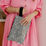 Our Black & White Spot Speckle print is an all-around fave! This eye-catching print celebrates simplicity and sophistication. Organization is so easy with these zipper pouches. Not only is it eco friendly, its size and trims have been refined to fit the daily essentials. Use as a nappy bag, throw in wet clothes, or simply store the essentials like your wallet, keys, sunglasses and makeup in your work bag. Wipe clean, zip it up and you’re good to go!