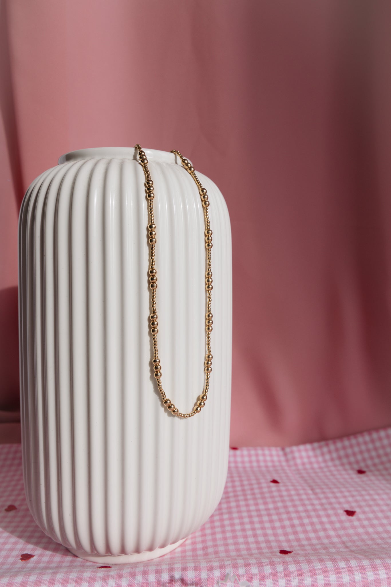 The Nancy Necklace is the perfect piece to elevate your layering game. Featuring gold beads strung delicately on an adjustable chain, this necklace adds a touch of elegance and shine to any look. The adjustable design allows for a customizable fit, making it easy to layer with other necklaces or wear on its own for a chic, minimalist vibe. Whether you’re dressing up or keeping it casual, the Nancy Necklace will effortlessly complement any outfit.