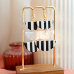 The Kelly Earrings offer a playful twist on modern minimalism. Featuring three cascading acrylic half-circles with a chic black-and-white striped pattern, these earrings swing effortlessly from delicate gold hooks, creating eye-catching movement and style. Lightweight and comfortable, the Kelly Earrings add bold visual interest to simple outfits and elevate any ensemble with ease. Wear them casually to brighten your everyday look or pair them with elegant pieces for a striking statement.