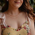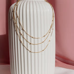 The Priscilla Necklace is a statement piece designed to add dimension and shine to any outfit. This necklace features three layers of 1mm box chains that create a bold yet delicate look, enhanced with beads that catch the light beautifully. The layers provide depth and texture, making this piece perfect for layering with other necklaces or wearing solo for a chic, sophisticated vibe. Whether dressed up or down, the Priscilla Necklace adds a stylish touch to your jewelry collection.