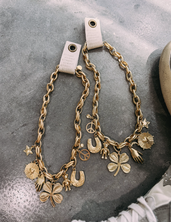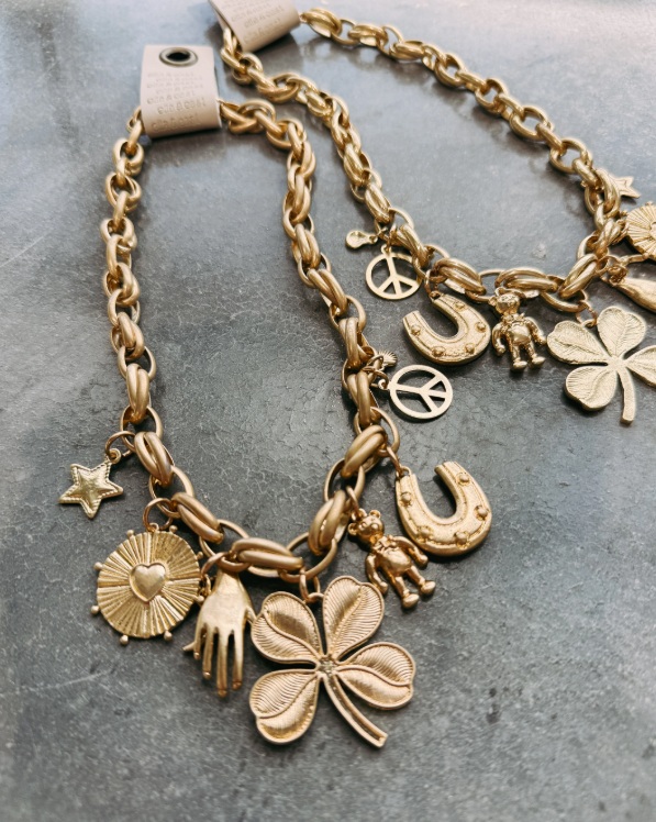 The Lucky Seven Necklace is your new good-luck statement piece. Featuring a bold, chunky gold chain adorned with seven unique charms, including a four-leaf clover, horseshoe, peace sign, and more, this necklace makes every outfit feel a little luckier. At 16" with a secure lobster claw clasp, it’s the perfect blend of trendy and timeless. Wear it solo as a bold statement or layer it with daintier chains for a perfectly styled look.