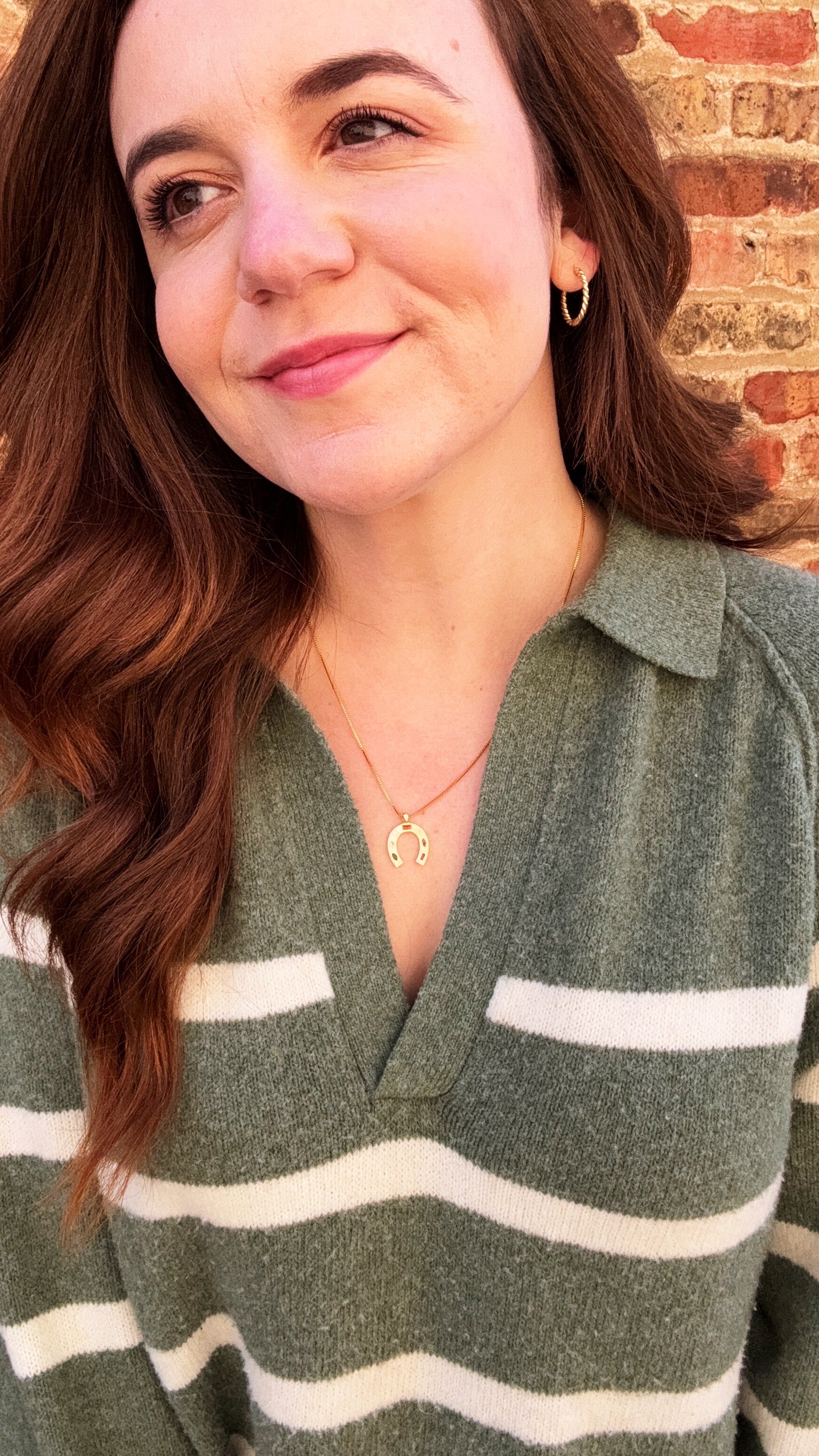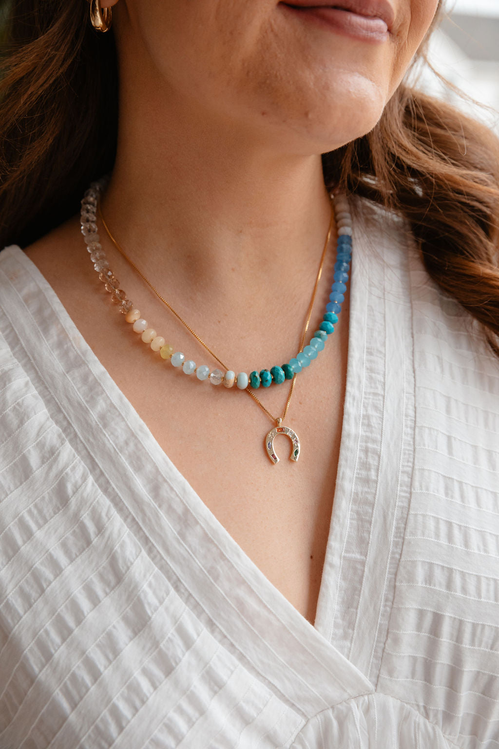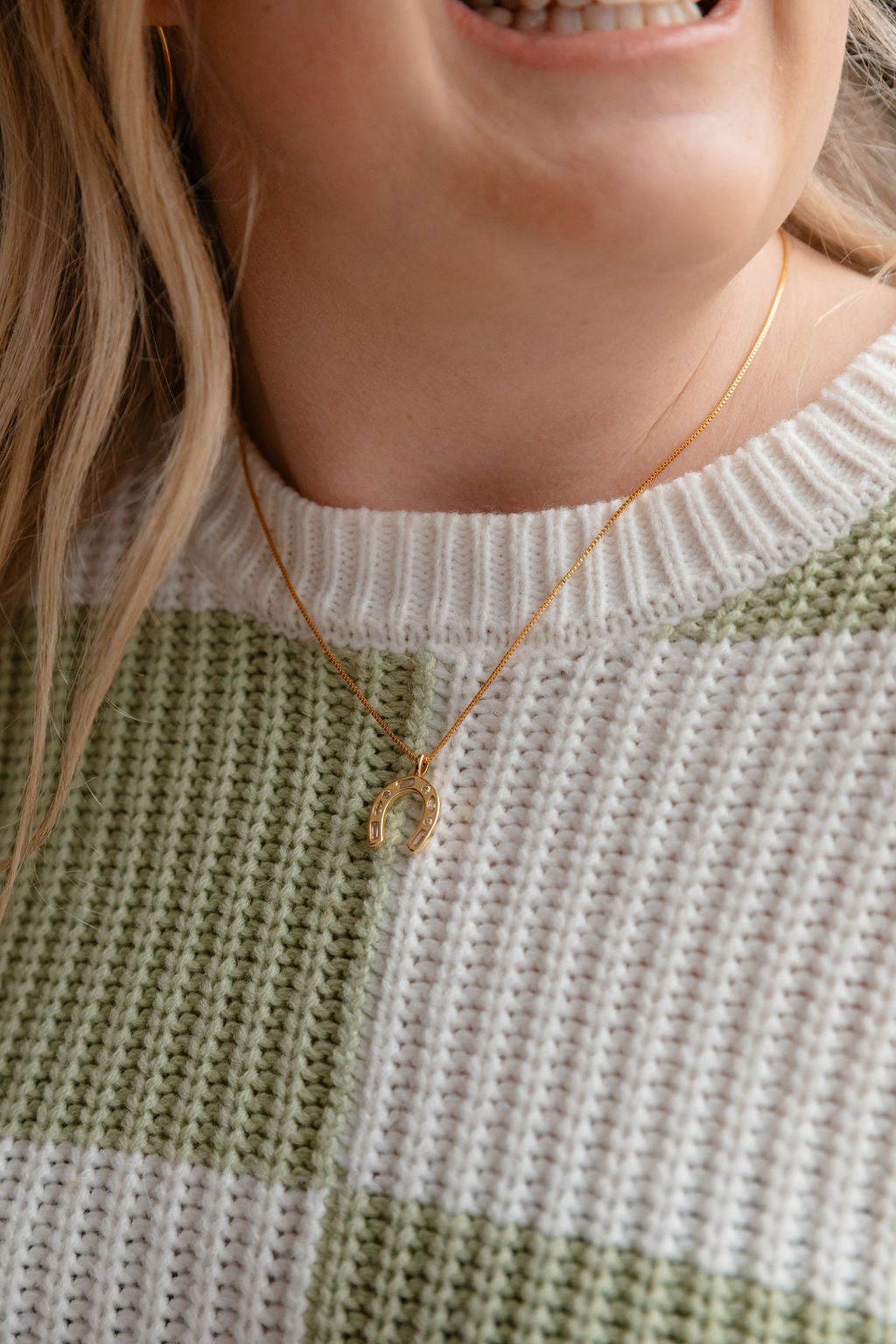 Get ready to channel the luck of the Irish with the Pickleback Necklace! This enchanting piece features a gleaming horseshoe pendant, traditionally a symbol of good fortune, adorned with sparkling clear cubic zirconia baguette stones that catch the light with every move. Suspended from a durable 20-inch gold-filled box chain, this necklace adds a touch of elegance to your St. Patrick's Day ensemble or any outfit needing a sprinkle of luck. Whether you're toasting with friends or dancing a jig, the Pickleback Necklace ensures you're both stylish and charmed.