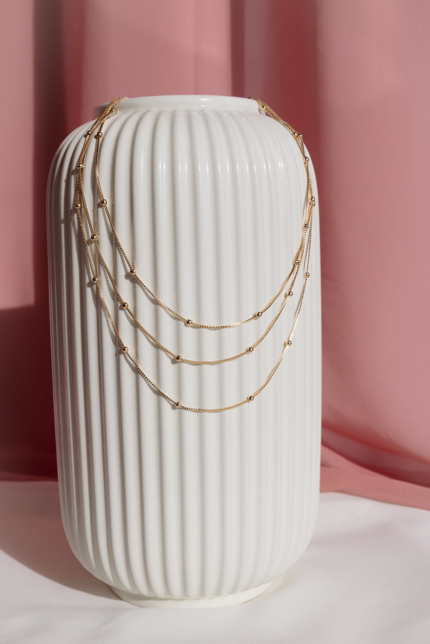 The Priscilla Necklace is a statement piece designed to add dimension and shine to any outfit. This necklace features three layers of 1mm box chains that create a bold yet delicate look, enhanced with beads that catch the light beautifully. The layers provide depth and texture, making this piece perfect for layering with other necklaces or wearing solo for a chic, sophisticated vibe. Whether dressed up or down, the Priscilla Necklace adds a stylish touch to your jewelry collection.