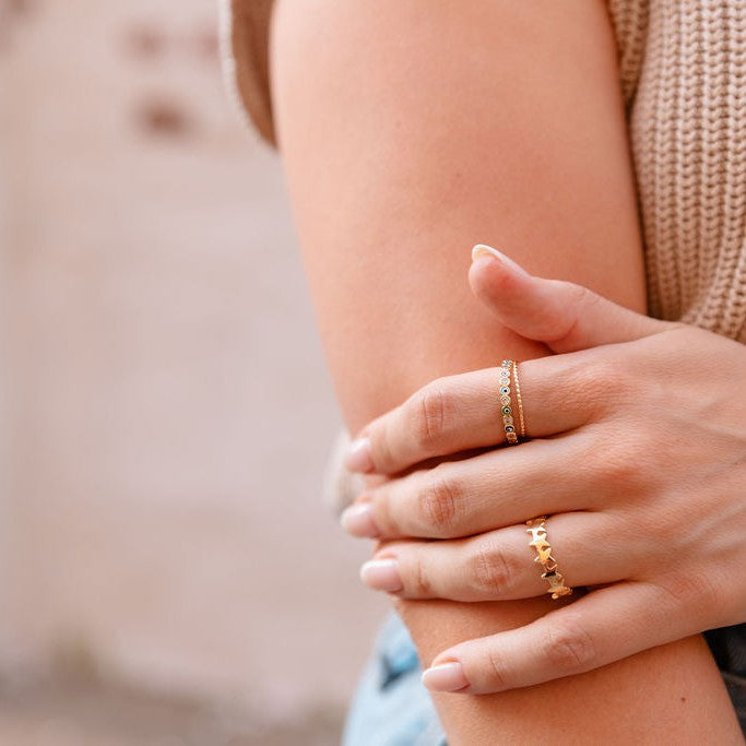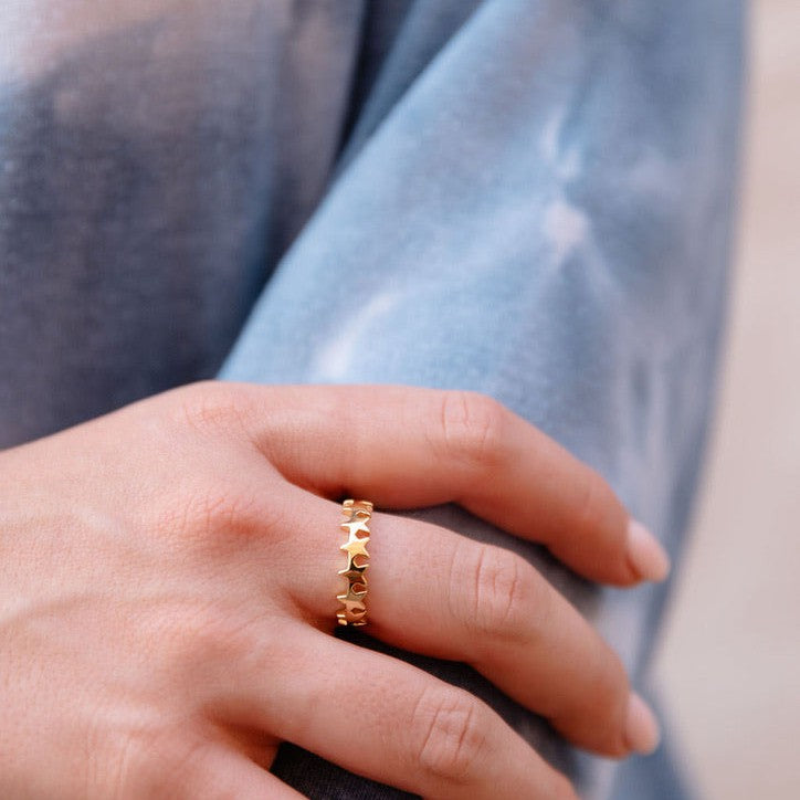The Ayanna Ring is a stunning tribute to the beauty of the night sky. Featuring a series of repeating stars, this ring adds a touch of celestial magic to your everyday style. Crafted from durable, tarnish-resistant gold-filled material, the Ayanna Ring offers both elegance and longevity, ensuring it maintains its shine for years to come. Whether you're stacking it with other rings or wearing it solo, its adjustable design provides a perfect fit for any finger.