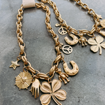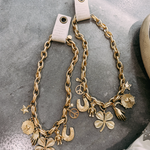 The Lucky Seven Necklace is your new good-luck statement piece. Featuring a bold, chunky gold chain adorned with seven unique charms, including a four-leaf clover, horseshoe, peace sign, and more, this necklace makes every outfit feel a little luckier. At 16" with a secure lobster claw clasp, it’s the perfect blend of trendy and timeless. Wear it solo as a bold statement or layer it with daintier chains for a perfectly styled look.