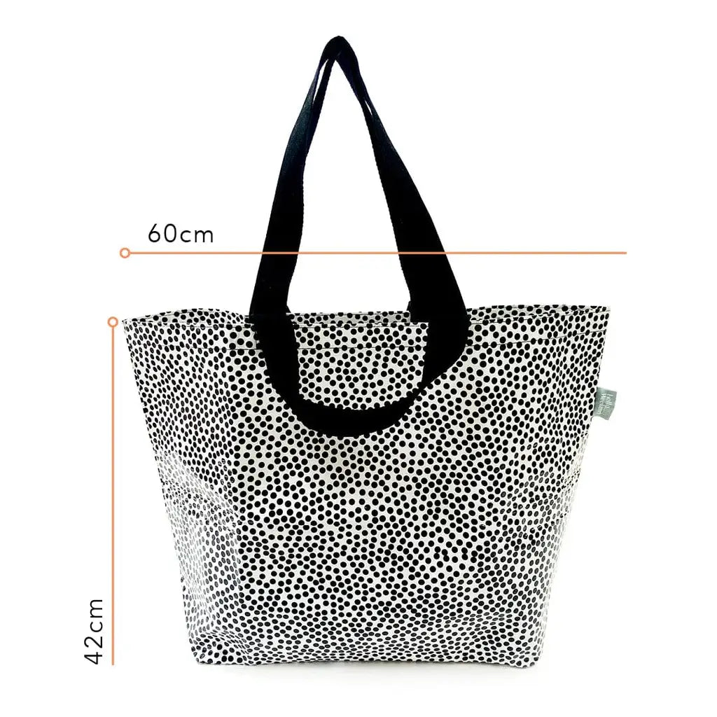 If bright colors aren’t your thing, this eye-catching black & white spotted print celebrates simplicity and sophistication. Feel good about choosing earth-saving products with this large tote bag. Not only is it eco-friendly - made from recycled plastic bottles - it’s beautifully designed for all occasions. Beach trips, weekends away, family picnics or just doing the grocery shopping. A lightweight, yet strong design means you’ll fit more in this bag than any other. Simply wipe clean, refold flat and tuck it away for next time.